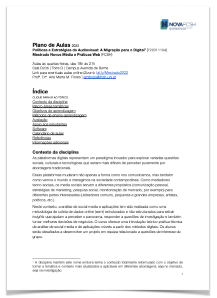 FCSH | Mestrado em Novos Media | 2022 2022Mestrado Novos Média e Práticas Web (FCSH)Profª. Drª. Ana Marta M. Flores | amflores@fcsh.unl.pt plano de aulas Aula #1 | 28/09/2022 | Slides | Referências Aula #2 | 12/10/2022 | Slides | Referências Aula #3 | 19/10/2022 | Slides Aula #4 | 26/10/2022 | Slides Aula #5 | 02/11/2022 | Slides Like Loading...
