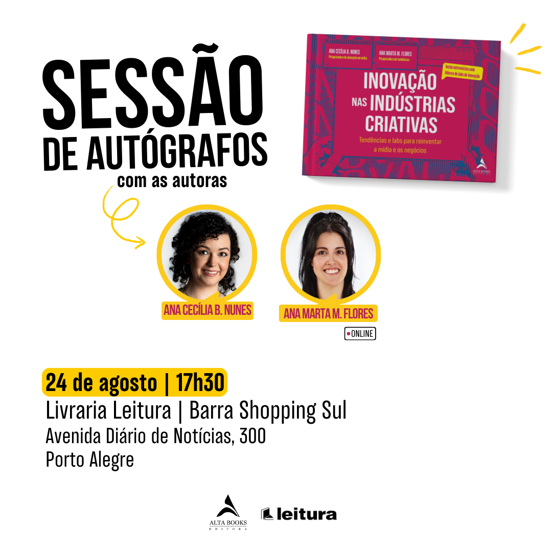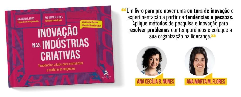 A inovação é um tema que costura o nosso trabalho e manteve o nosso processo de criação enriquecedor. Escrever um livro à distância – com um oceano no meio – foi outro desafio que valeu a pena aceitar. O Grupo Editorial Alta Books foi que fez tudo possível e hoje temos o pré-lançamento do “Inovação nas Indústrias Criativas: tendências e labs para reinventar a mídia e os negócios”. O livro chegou às livrarias do Brasil no dia 30 de junho e já está disponível na Amazon Brasil.